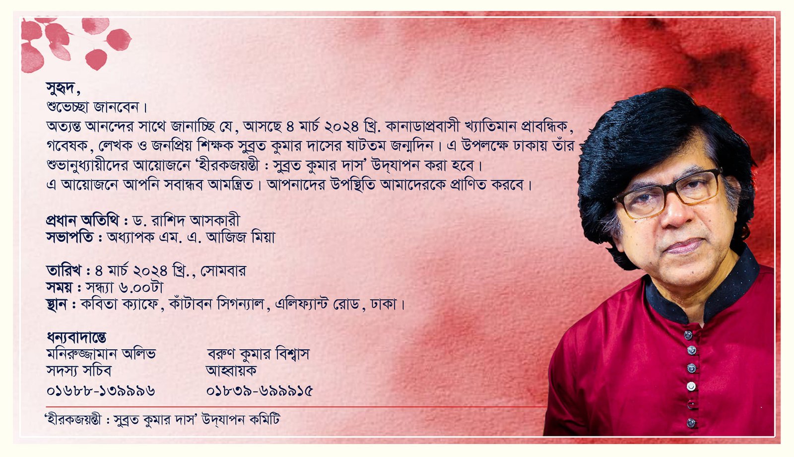 ByNRBGTV কনটেন্ট কাউন্সিলরসোমবার, ৪ মার্চ, ২০২৪কানাডাপ্রবাসী খ্যাতিমান প্রাবন্ধিক,গবেষক, লেখক ও শিক্ষক সুব্রত কুমার দাসের ষাটতম জন্মদিন উপলক্ষ্যে বিশেষ অনুষ্ঠানের আয়োজন করা হয়েছে ঢাকায়। আগামী সোমবার (৪ মার্চ) রাজধানী...