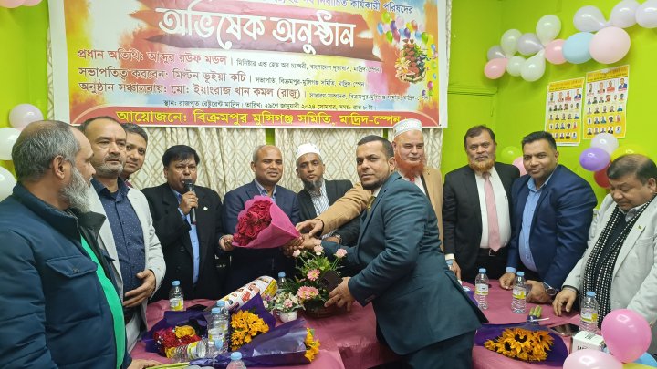 বিক্রমপুর মুন্সিগঞ্জ সমিতির স্পেনের নবনির্বাচিত সভাপতি মিল্টন ভুঁইয়া কচির সভাপতিত্বে এবং সাধারণ সম্পাদক ইয়াংরাজ খান কমল রাজুর পরিচালনায়, অনুষ্ঠিত অভিষেক অনুষ্ঠানে প্রধান অতিথি হিসেবে উপস্থিত ছিলেন বাংলাদেশে দূতাবাস স্পেনের মিনিষ্টার এন্ড হেড অব চ্যান্সরী আব্দুর রউফ মন্ডল । অনুষ্ঠানের বিশেষ অতিথি হিসেবে উপস্থিত ছিলেন বায়তুল মোকাররম মসজিদ কমিটির সভাপতি খোরশেদ আলম মজুমদার, বাংলাদেশ এসোসিয়েশন ইজ স্পেনের সভাপতি আল মামুন ,সাবেক সভাপতি জামাল উদ্দিন মনির ,কাজী এনায়েতুল করিম তারেক, সাবেক সিনিয়র ভাইস প্রেসিডেন্ট আলামিন, সাবেক সাধারণ সম্পাদক কামরুজ্জামান সুন্দর ,বাংলাদেশ অ্যাসোসিয়েশন ইন স্পেনের নির্বাচন কমিশনের সাবেক সদস সচিব দুলাল সাফা, সাংগঠনিক সম্পাদক ওহিদুজ্জামান ওহিদ গ্রেটার সিলেট অ্যাসোসিয়েশন ইনস্পেন এর সভাপতি আব্দুল মুজাক্কির ,স্পেন আওয়ামী লীগের ভারপ্রাপ্ত সভাপতি আব্দুল কাইয়ুম সেলিম, স্পেন বিএনপির সাধারণ সম্পাদক রমিজ উদ্দিন, গ্রেটার সিলেটে এসোসিয়েশন ইন স্পেনের উপদেষ্টা মাওলানা আসাদুজ্জামান রাজ্জাক, আব্দুল কাইয়ুম মাশুক, এইচএম দবীর তালুকদার, ভালিয়ান্তে বাংলার সভাপতি ফজলে এলাহী, মনির হাওলাদার ,ঢাকা জেলা অ্যাসোসিয়েশনের সাধারণ সম্পাদক এসএম মাসুদ, সহ-সভাপতি রুবেল সামাদ, নোয়াখালী সভাপতি আবুল কাশেম মুকুল, নারায়ণগঞ্জ জেলায় এসোসিয়েশন ইন স্পেনের সাধারণ সম্পাদক শওকত আহমেদ, সৈয়দ মাসুদুর রহমান নাসিম প্রমূখ |বিক্রমপুর মুন্সিগঞ্জ সমিতির পক্ষ থেকে বক্তব্য রাখলেন, প্রধান উপদেষ্টা একেএম জহিরুল ইসলাম, মাহবুবুর রহমান ঝন্টু, রাসেল দেওয়ান, মুজিবুর রহমান ববি, সেলিম মিয়া, সুমন নূর, রানা আবেদীন, সিনিয়র সহ সভাপতি আল আমিন শেখ, সহ সভাপতি তাহের শেখ, কাজী বাবুল, যুগ্ম সম্পাদক সেলিম হাসান, সেলিম۔ দেওয়ান খোকন, সাংগঠনিক রবিউল ইসলাম রবু , সহ সাংগঠনিক সম্পাদক টুটুল শেখ।